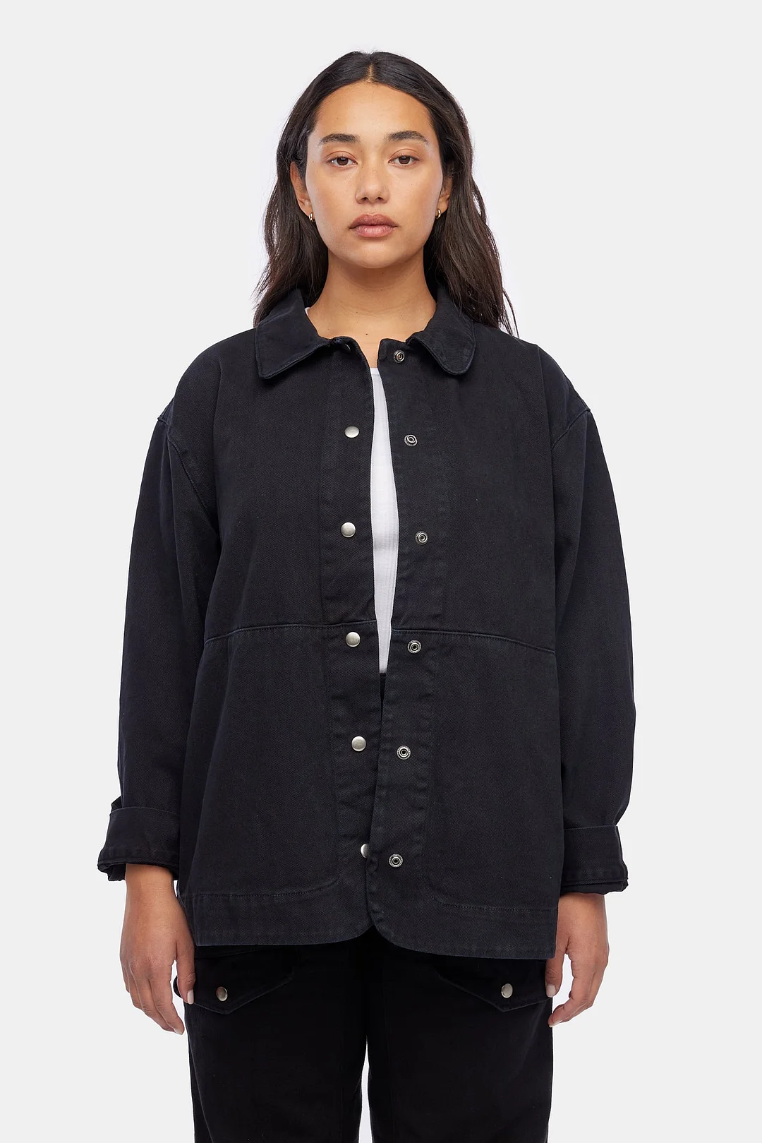 Our updated spin on a classic workwear jacket. Made from garment dyed bull denim with hidden side seam pockets and snap closure.