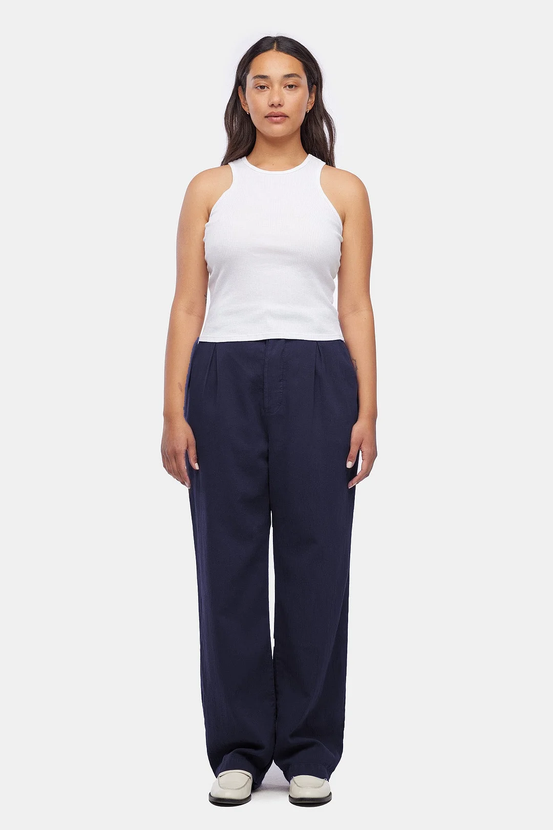Classic everyday slacks designed with a wide waistband, full-length straight leg, button fly, and subtle pleats for a relaxed yet structured silhouette. Crafted from a lightweight, textured cotton and Tencel blend canvas that offers breathability, softness, and durability.