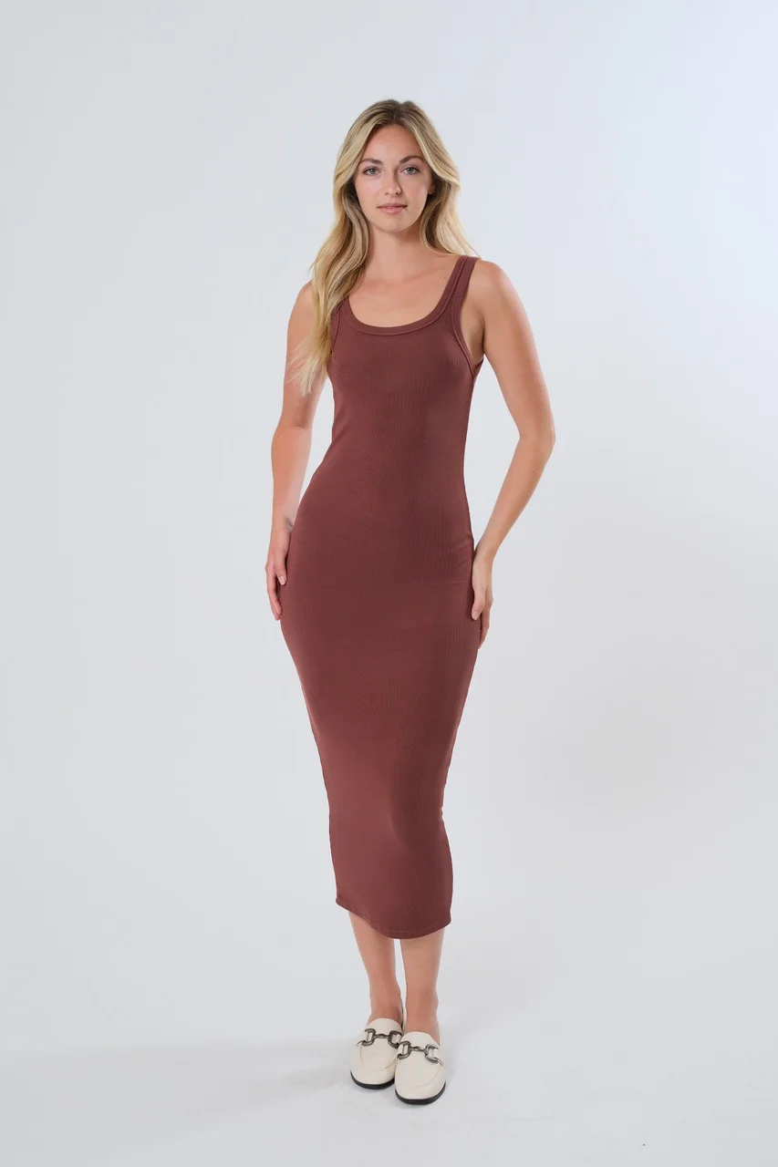 A sleek, figure-flattering slip dress featuring a chic square neckline, carefully crafted from our luxurious 2x1 rib knit fabric in a sophisticated Mocha Mousse shade. Enhanced with a hint of spandex, it provides a snug, supportive, and comfortably flexible fit. Made from premium siro spun micro modal, a semi-synthetic, sustainably-derived fiber known for its silky-smooth feel and elegant drape, this dress elevates any wardrobe with effortless style.