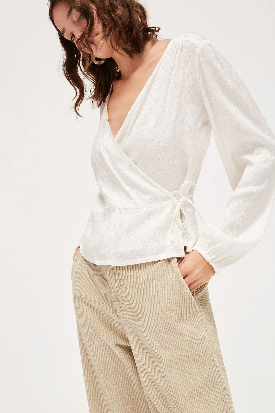 A romantic wrap top crafted from a super soft satin paisley jacquard. The Onyx Wrap Top features a fluid drape and elegant wrap silhouette that flatters the body while remaining easy to wear. Designed to feel elevated yet effortless, it transitions seamlessly from day to evening.